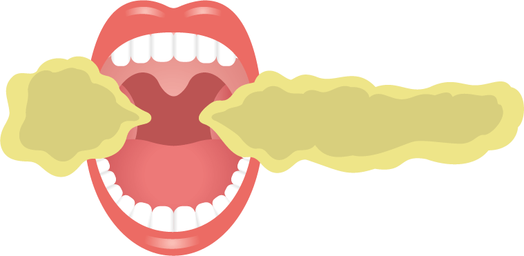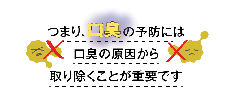 口腔細菌が食べ物カスを分解すると、口臭の原因物質をつくり出す。