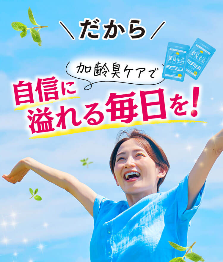楽臭生活で加齢臭の心配がなくなりました。もう大丈夫かなと2か月ほど休んでいたのですが、自分の部屋に入ったとき、また臭いがし始めました、やはりこれは欠かせません。本当に感謝しています。
