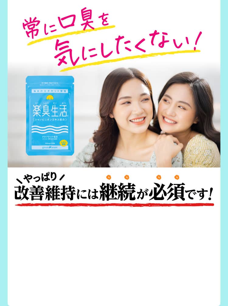 もう12年くらい前から続けて飲んできました。飲み始めたきっかけは、口臭でした。自分でもアレ?って思うことが時々あり、歯磨きやガムを噛んだりして気をつけていました。でもある時、お友達の表情が一瞬固まり、それから頻繁にガムなどを勧められることが多くなりました。「やっぱり臭いのかな…」と気になり出し、色んな消臭アイテムを試してみたがあまり効果を感じられずにいました。ネットで検索して出てきたのが、この「楽臭生活」でした。最初の1ヶ月は半信半疑で、2ヶ月目くらいから便通が改善されました。そのくらいから、周りの人の反応も変わってきたことに気づきました。途切れたことが何度かありましたが、1ヶ月くらい離れてしまうと、また便通が乱れ始め、そうすると口臭も気になり始めてきます私の場合のバロマーメーターは便通の変化です。周りを気にせず話せるのは「楽臭生活」のお陰です。ありがとうございます!