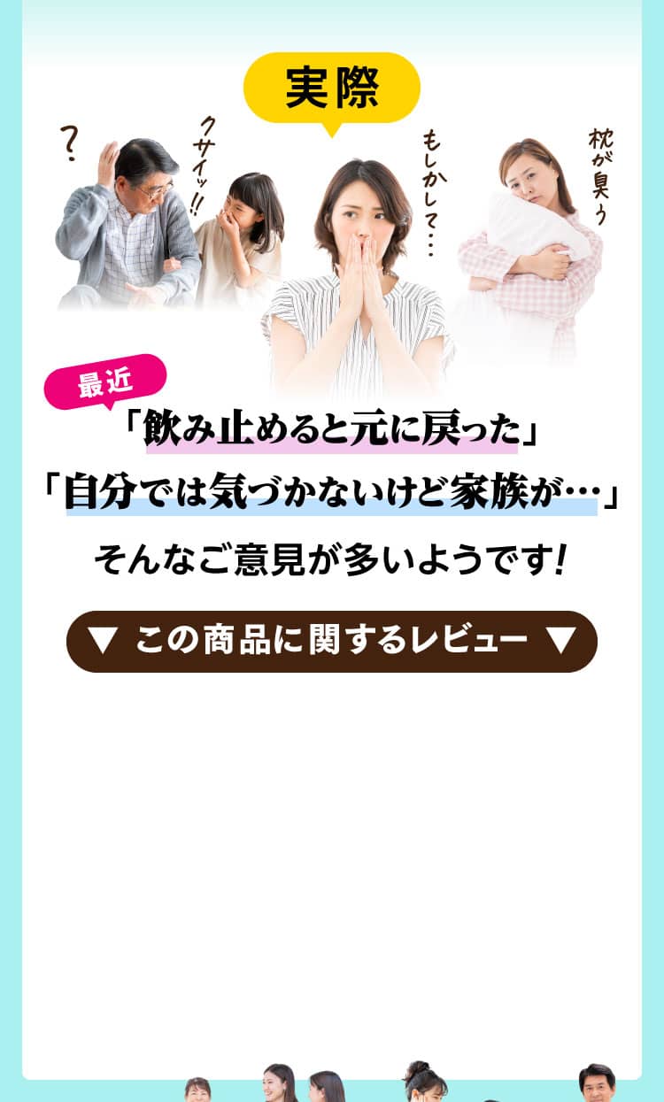 50歳になり自分の体臭が気になるようになりました。色々サプリを探してこちらに決めました。まだ3回目ですが少しきいてる気がします。飲まなかった日はやっぱり臭うので効果があると思います。これからも続けていきたいです。