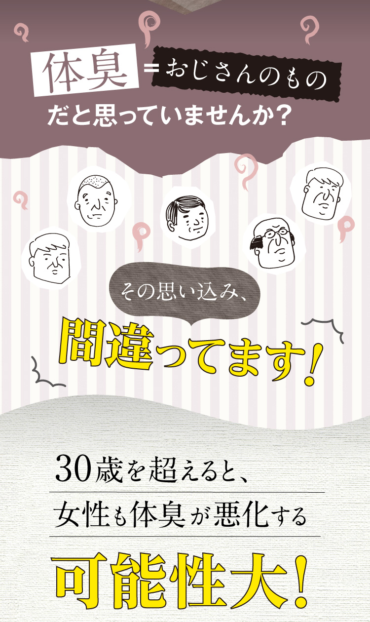 50歳になり自分の体臭が気になるようになりました。色々サプリを探してこちらに決めました。まだ3回目ですが少しきいてる気がします。飲まなかった日はやっぱり臭うので効果があると思います。これからも続けていきたいです。
