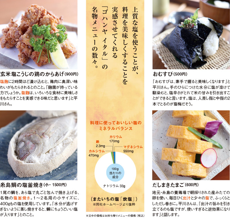 カスタードプリンの上に、一番結晶(※)の花塩からできるプリン専用の塩「潮の粒」を乗せ、カラメルソースをかけていただく名物のプリン。卵は地元・糸島の養鶏場で朝採りしたもの。牛乳は佐賀県の低温殺菌牛乳を使用しています。一口ごとに、潮の粒のザリッとした食感と直後に広がる塩と、混ざり合っていく濃厚なプリンの味が絶妙な逸品です。『工房とったん』で購入することができ、海を眺めながらじっくりと味わえます。